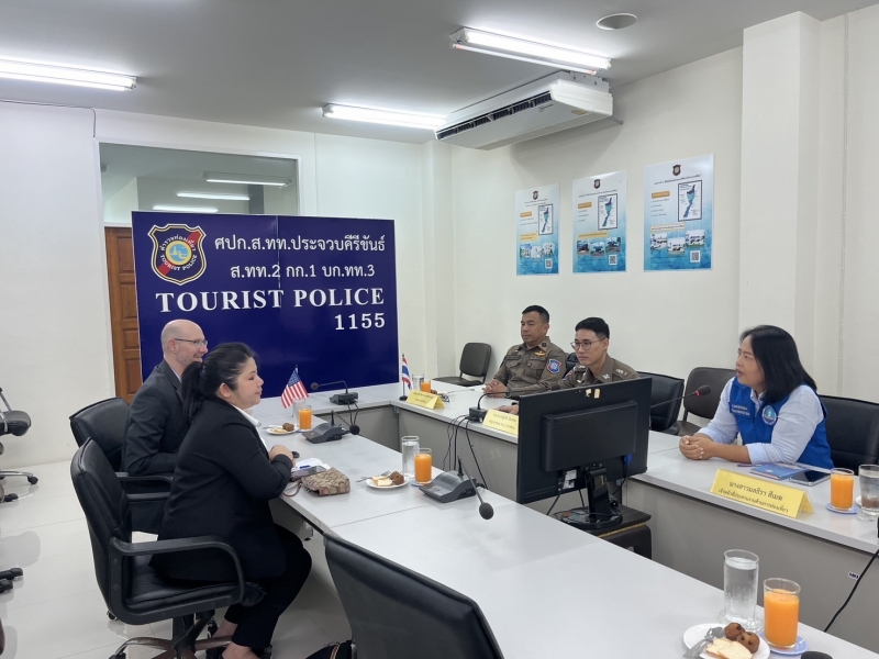 พร้อมด้วย คุณมลธิรา สีเมฆ เจ้าหน้าที่ประสานงานด้านการท่องเที่ยว จากศูนย์ช่วยเหลือนักท่องเที่ยวจังหวัดประจวบคีรีขันธ์ ให้การต้อนรับ นายโรเบิร์ต โรบินสัน (Mr.Robert Robinson) รองผู้ช่วยทูตป้องกันกองกำลังสหรัฐอเมริกาหน่วยป้องกันกองกำลังสหรัฐอเมริกา ประจำประเทศไทย พร้อมคณะ เข้ามาประสานเจ้าหน้าที่ตำรวจท่องเที่ยวหัวหิน เพื่อสำรวจจำนวนนักท่องเที่ยวชาวอเมริกาที่พักอาศัยในพื้นที่หัวหิน และให้ช่วยดูแลนักท่องเที่ยวชาวอเมริกาที่มีปัญหา